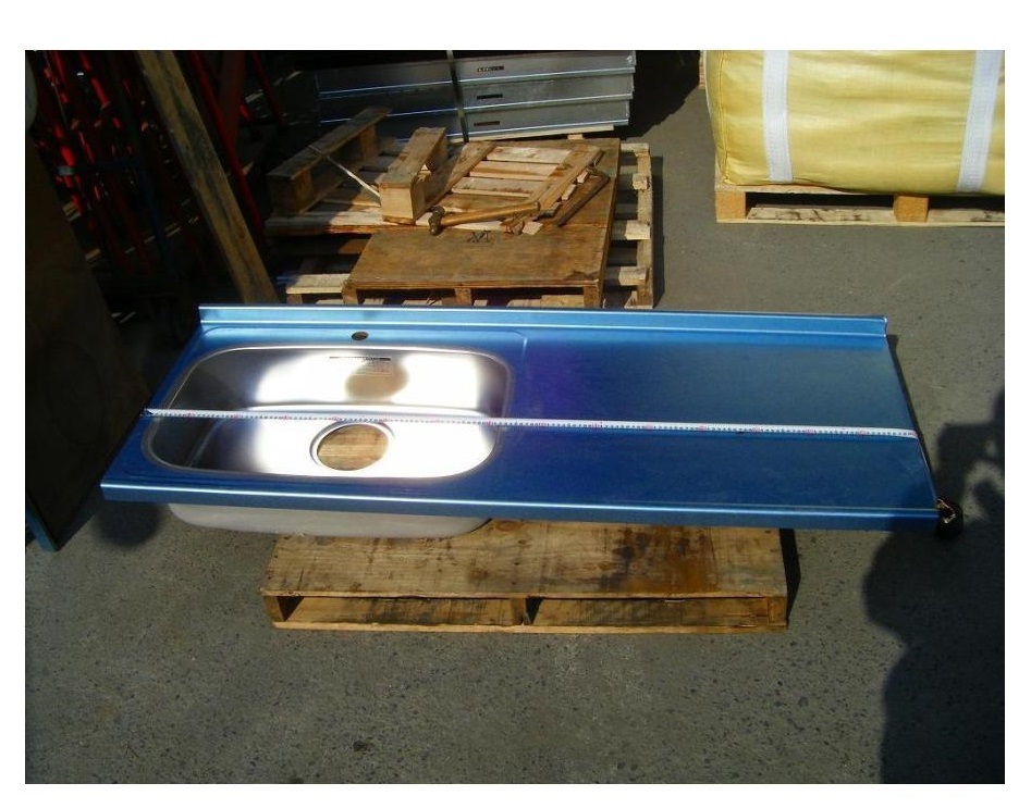 > C2A【新長棚060823-8(7)】左シンク150cm巾 厚み0.5ミリ 流し台ステンカウンター 裏面ボード多少雨水シミあり