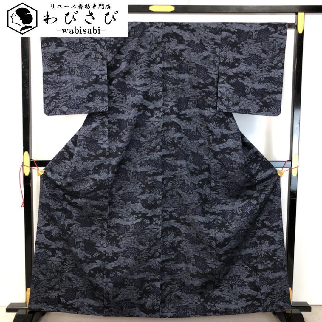 > 紬着物 真綿紬 花草模様 風景柄 留紺色 K-5003 着物 きもの kimono 和服 和装 中古 リサイクル着物 【送料無料】
