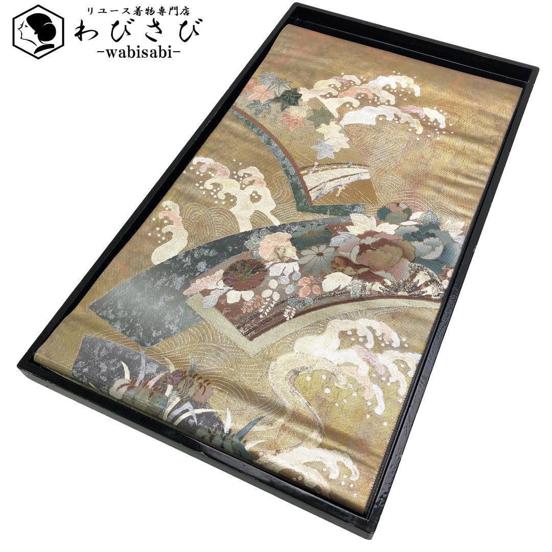 - 袋帯 螺鈿匠 於利部寿名宝 螺鈿箔 波に花模様 金色 O-5299 着物 きもの kimono 和服 和装 中古 リサイクル着物 【送料無料】