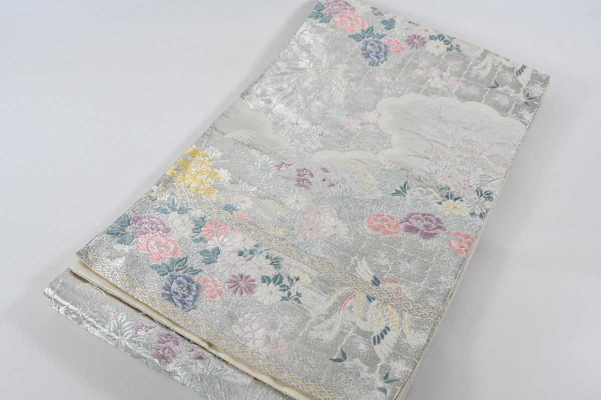 - 袋名古屋帯 六通柄 銀糸 雲文 花 帯丈414cm ★着物屋 ne-15670 桜庭呉服店
