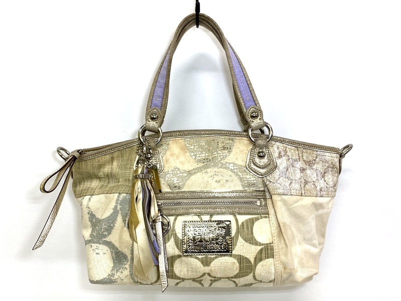- 【即決】COACH コーチ シグネチャー ポピー ハンドバッグ パッチワーク キャンバス ベージュ ゴールド 16732 ≪難あり≫