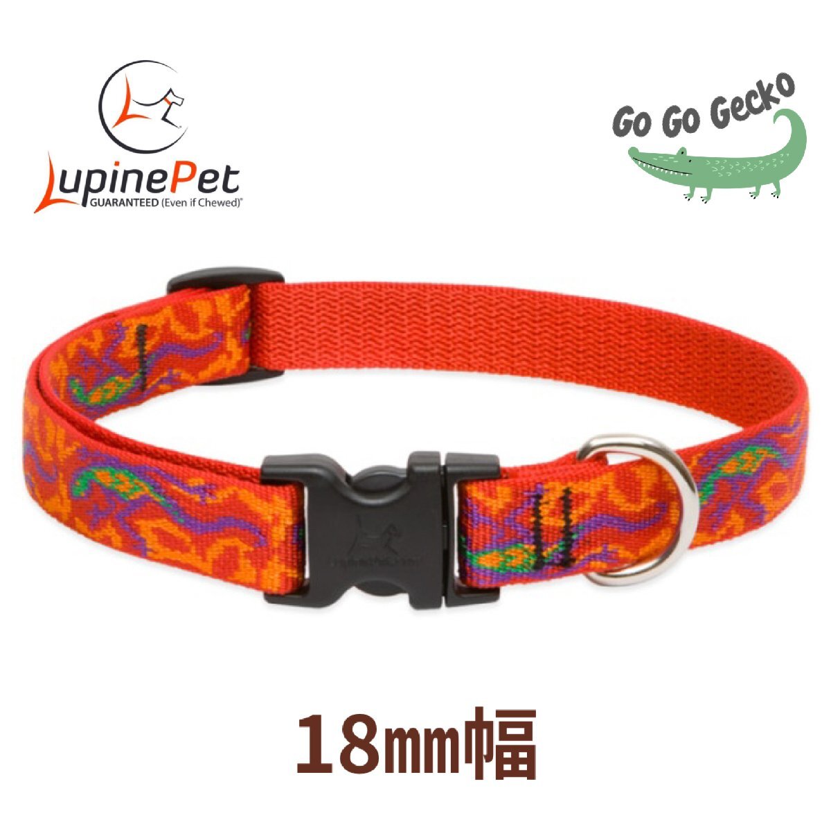 - ワンタッチ首輪・Mサイズ・18mm幅 Go Go Gecko柄 33-56cm LUPINEルパイン アメリカ製 軽量丈夫 中型犬 アジャスタブル