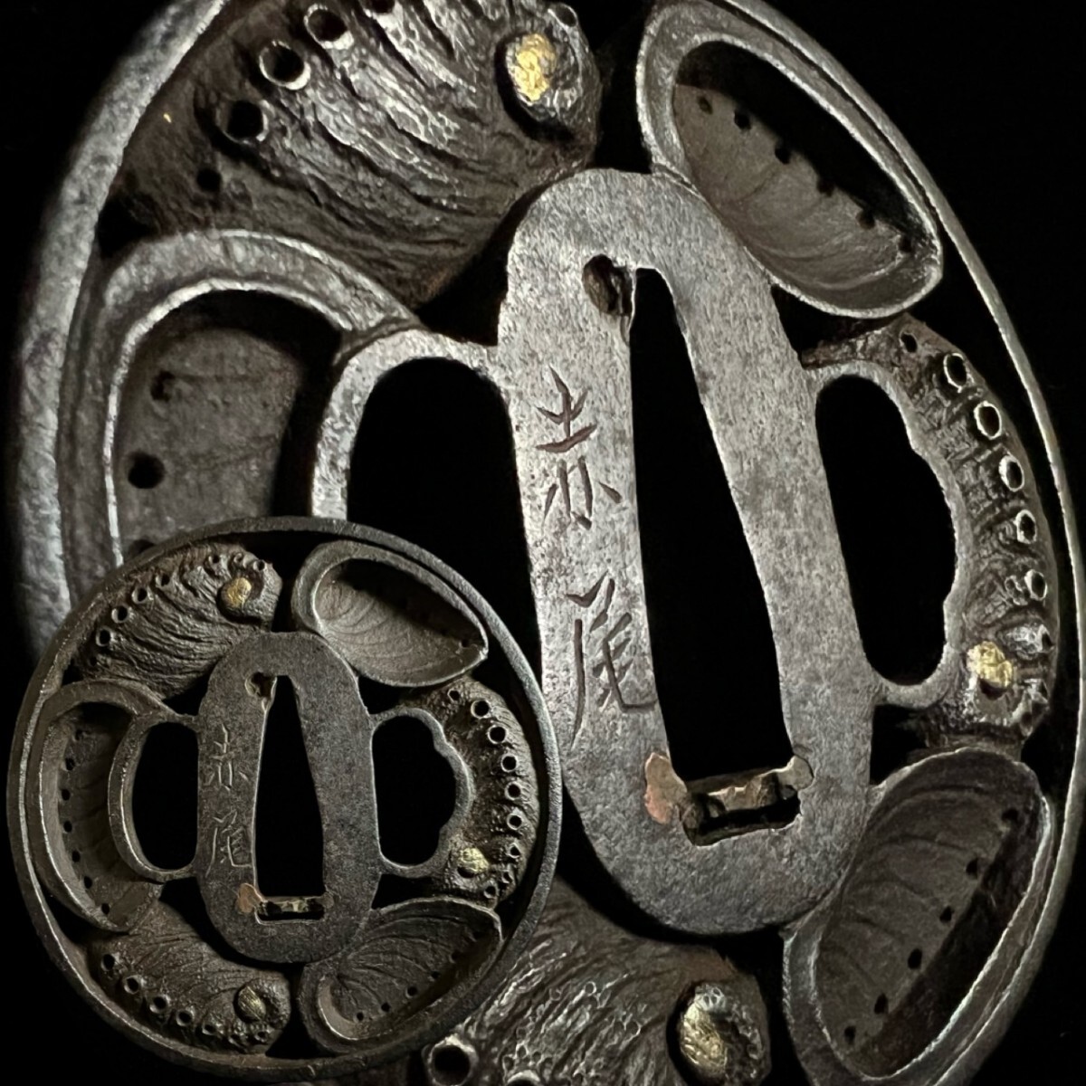 > 刀剣美術 江戸時代 在銘 赤尾 鉄地 金色絵巴鮑彫刻透鍔 6.95cm 90g 桐箱付 細密彫刻 鋤出彫 金象嵌 赤尾吉次 丸鍔 刀装具 時代武具骨董[麌]