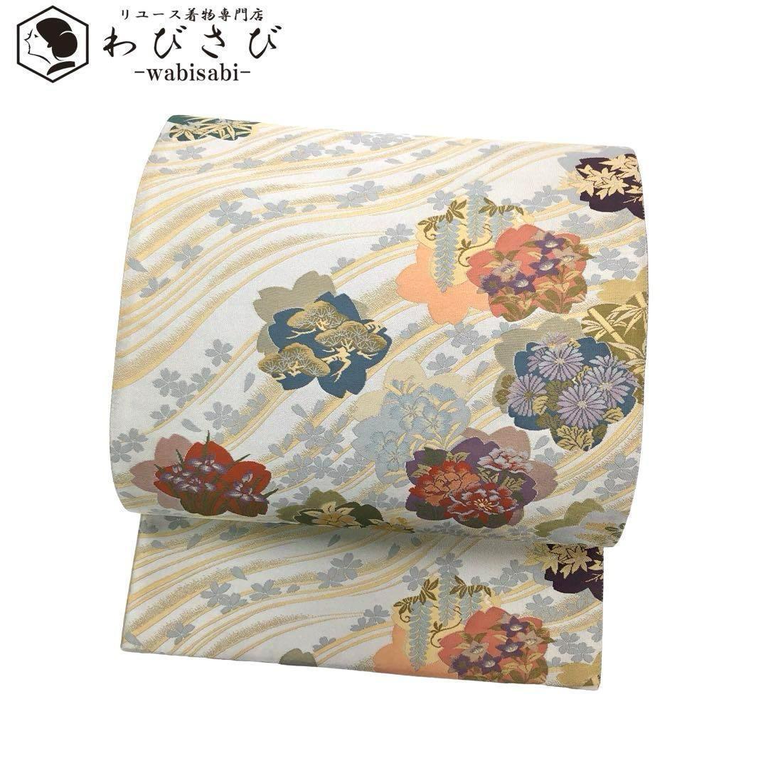 > 袋帯 作家物 黄櫨染 桜の花柄の中に四季の花模様 雲井鼠色 O-3310 着物 きもの kimono 和服 和装 中古 リサイクル着物 【送料無料】