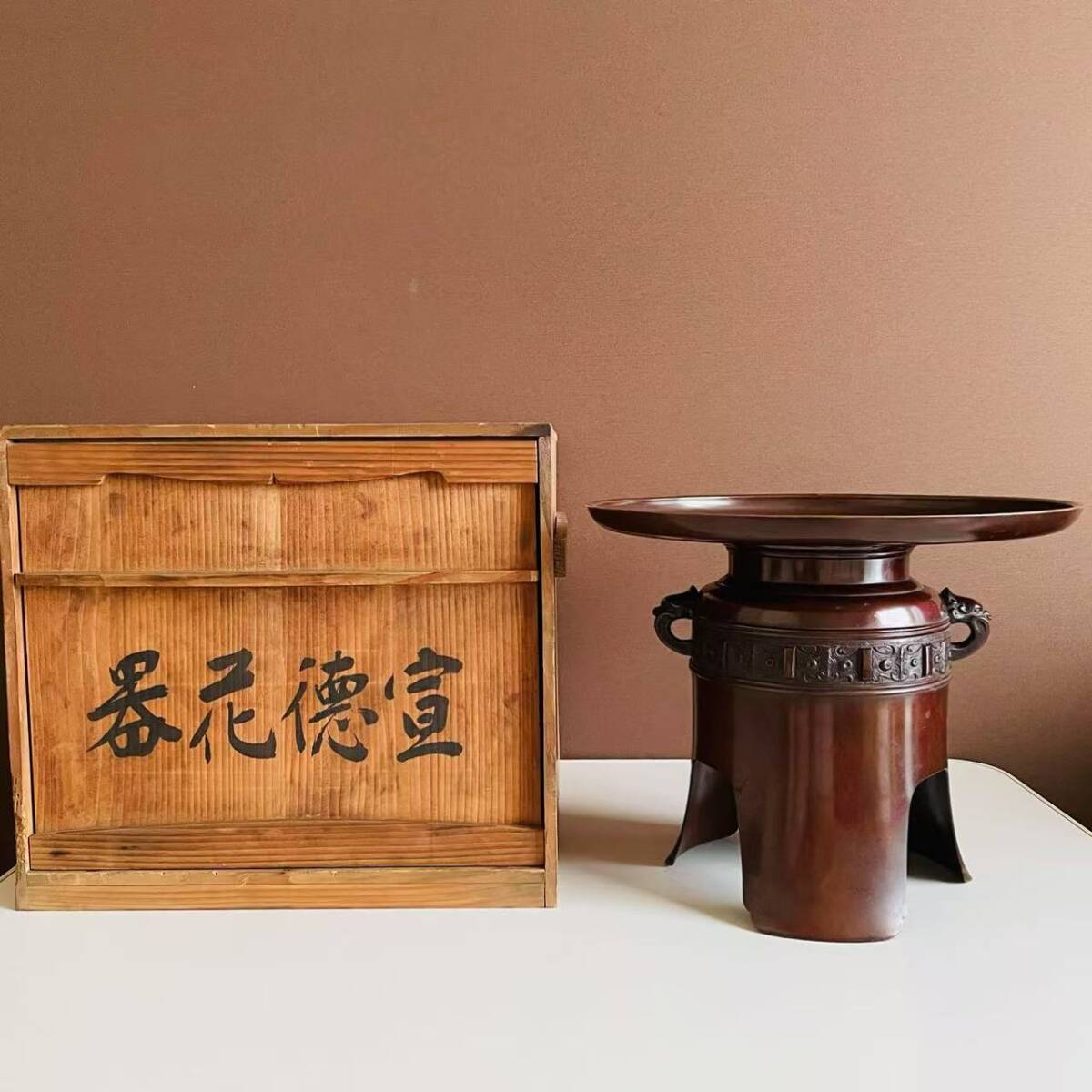 - 薄端 宣徳花器 在銘 銅製 唐銅 花瓶 置物 花入り 三つ足 象両耳 重さ3.8kg 共箱