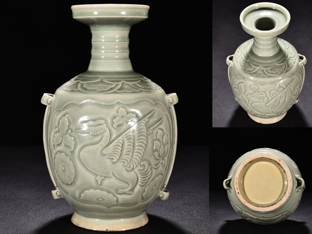 - TB405■宋時代 耀州窯 青磁刻花卉紋穿帯盤口瓶 時代物 古玩 唐物 古陶磁器■