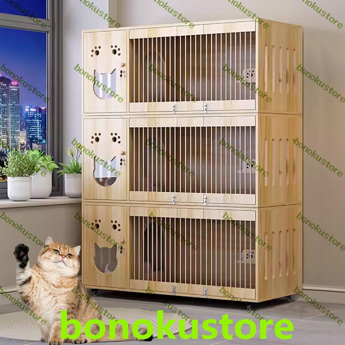 - 木製多機能キャットハウス 猫用コンドミニアム キャスター付き室内用キャットエンクロージャー 爪とぎポスト付き 140x60x168cm