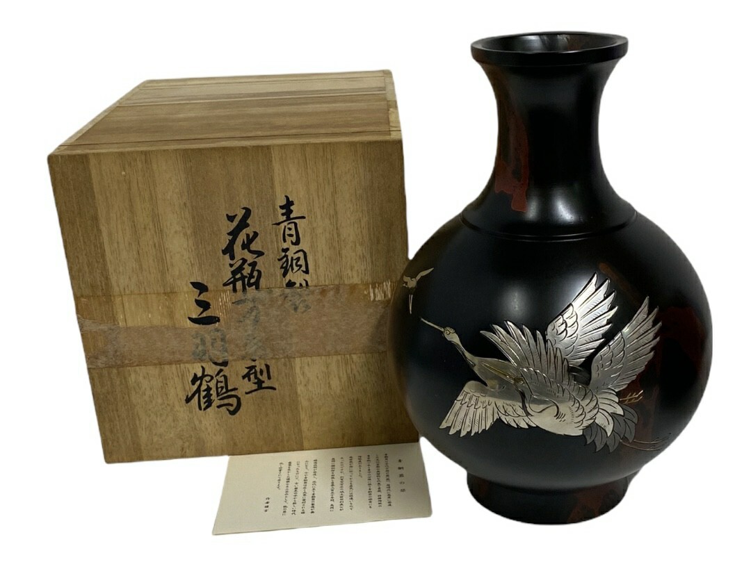- 【未使用品】 青銅器 花瓶 三羽鶴 高岡峰雲作 高さ約38cm 花器 花生 21K405
