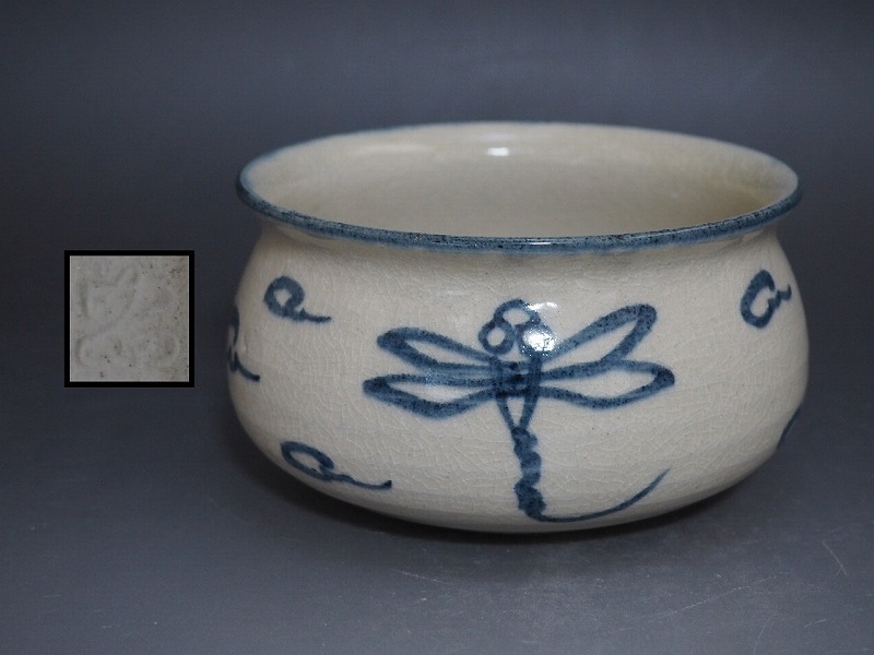- A4222 加藤忠 作 雲蜻蛉文 建水 ☆ 茶道具 茶器 抹茶道具 茶懐石 茶事 こぼし 水覆 水翻 水下 納汚 陶器 作家物 在銘 陶印 美品 良品 無傷