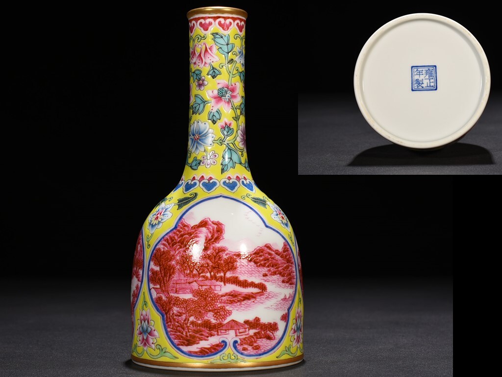 > ■XM117■清 雍正年製款 黄地琺瑯彩 開窓煙脂紅釉 山水紋 搖鈴尊 時代物 古玩 唐物 古陶磁器■