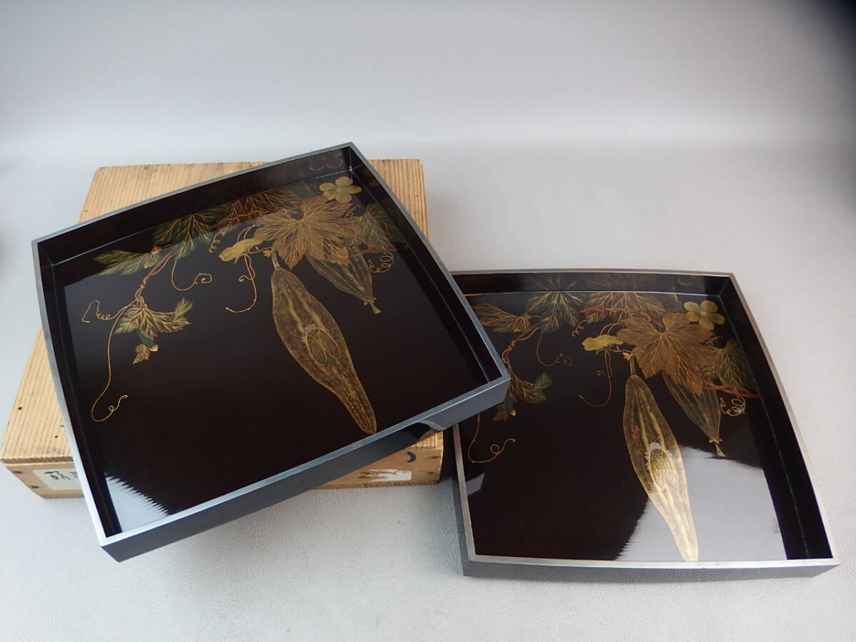- 【骨董・茶道具】★古い 金銀蒔絵 梨地★★研出蒔絵糸瓜蝉文組盆 gm042sl 懐石道具 和食器