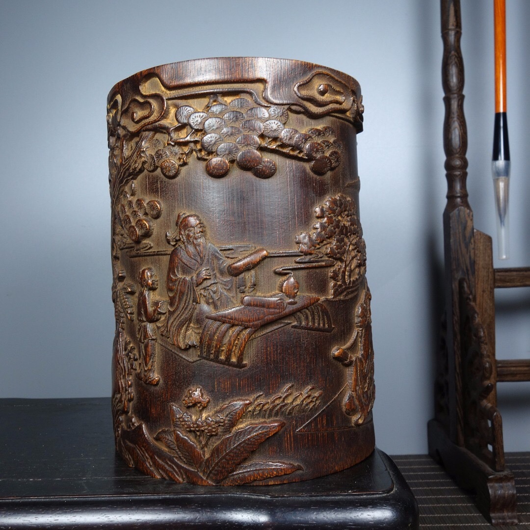 - 『館蔵珍品 竹材細密彫 孔子授學紋 筆筒 置物 賞物』稀少珍蔵品 古賞物 貴重物品 収蔵品 中国古美術 時代物 古董品