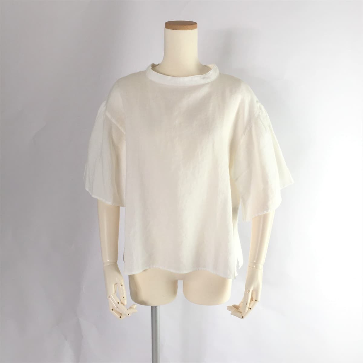 上品な光沢感のあるリネン100%素材。バックにフリルを施し、広がりを持ったワイドスリーブが気になる部分も隠してくれるデザインで、風通しが良く涼しげに着て頂けます。裾のサイドにはスリットが入りトップスインもオススメのアイテムです。