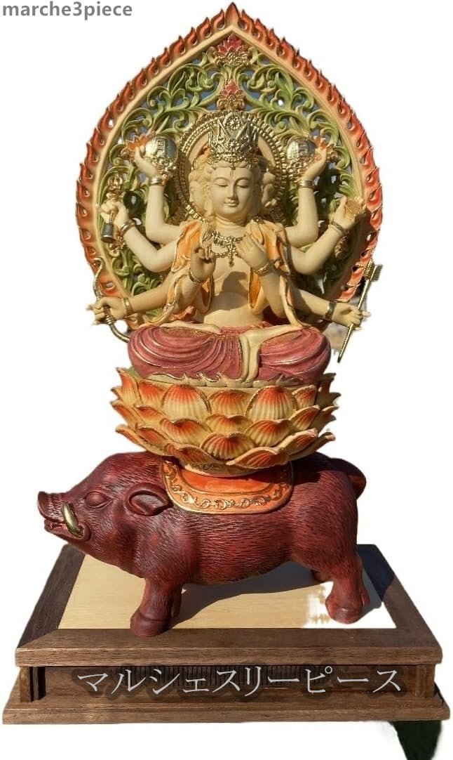 - 仏像 摩利支天 座像 騎猪像 彩色 木造 精密細工 木彫仏像 総高35cm