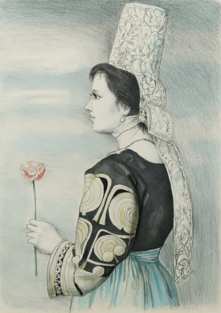 ・芝田米三「花を持つ女性」24/150 リトグラフ 額装品 /版画 人物画 具象派