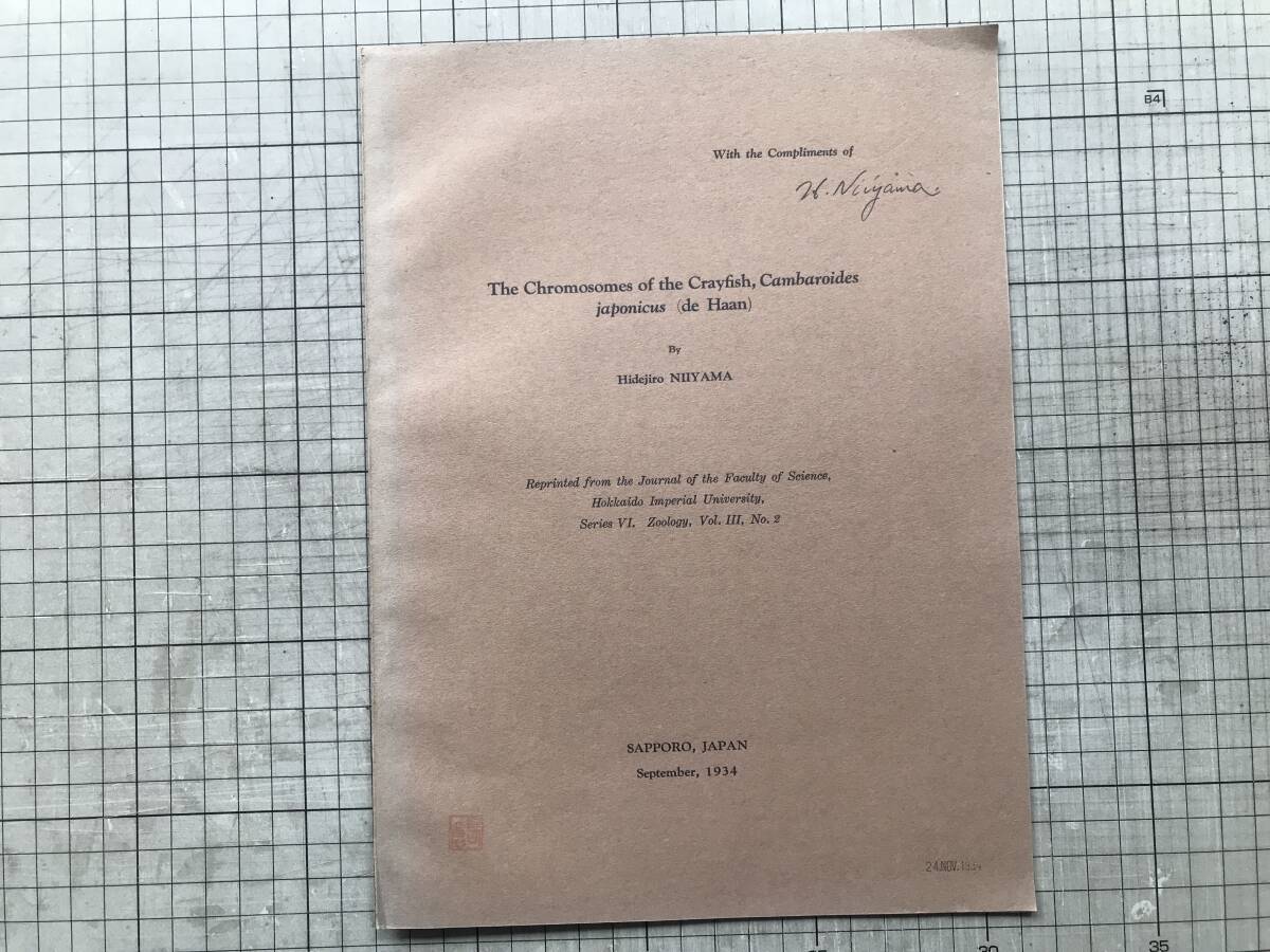 - 『The Chromosomes of the Crayfish~ ザリガニの染色体 北海道帝国大学理学部紀要第3巻第2号別刷』新山秀次郎 1934年刊 ※札幌 00378