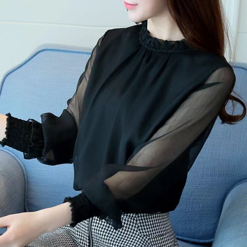 > ☆ ブラック ☆ S ☆ シフォンブラウス トップス レディース シフォンブラウス 長袖 ブラウス シャツ フリルブラウス 立ち襟 カットソー