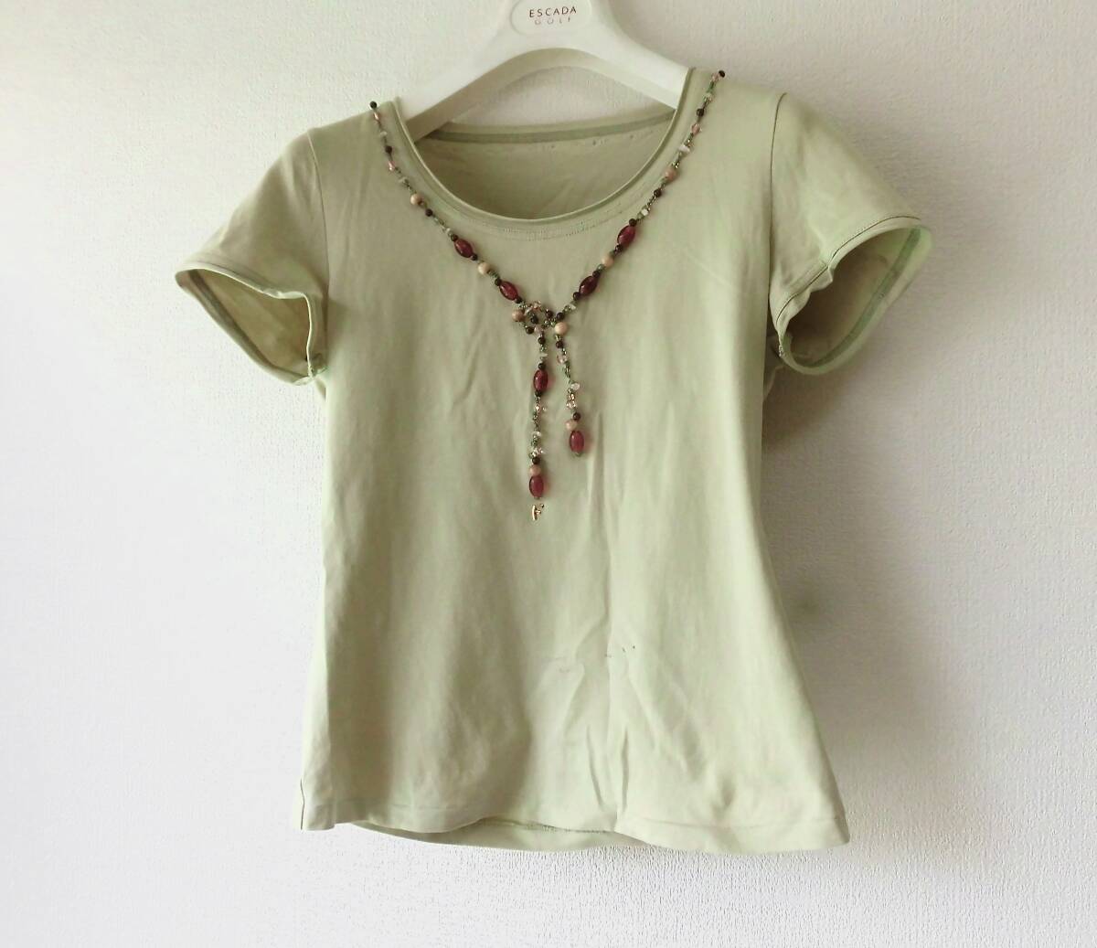 - ●豪華ネックレス刺繍/オリーブグリーンのカットソー 半袖トップス/サイズM~L相当