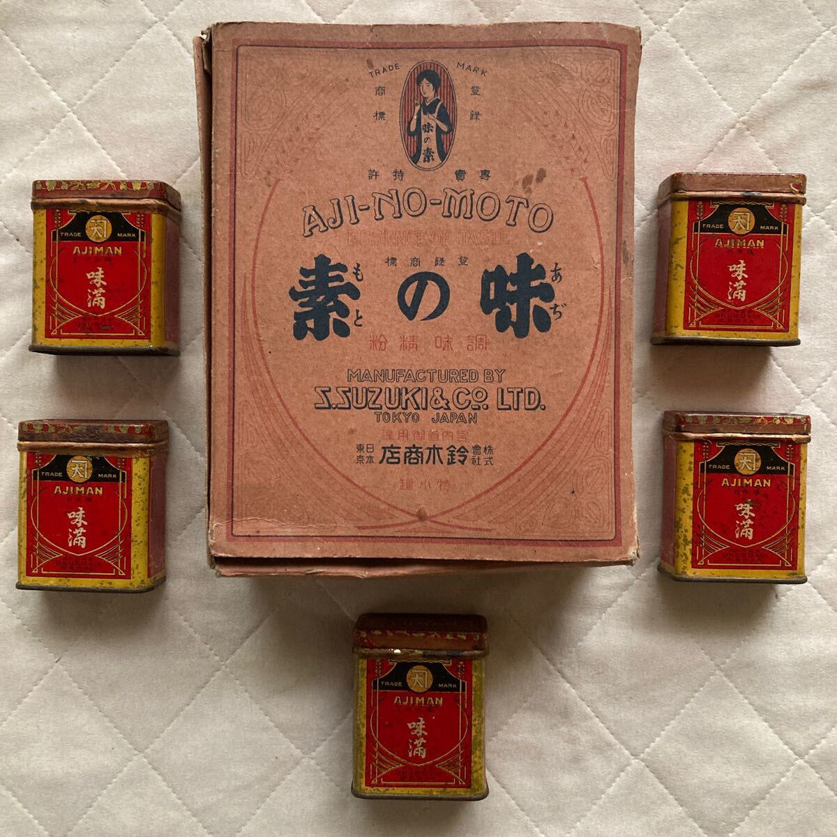 - 大正時代.昭和時代初期.AJINOMOTO.味の素.鈴木商店.箱付.日本東京.当時物.AJIMAN.味満.調味料.缶.大久保商店.五個.重さ約174g当時物.完品.