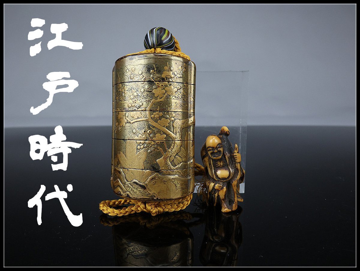 【志】A010 【江戸時代】 本金彩蒔絵 松梅紋 5段 印籠 鹿角根付/時代のダメージあり!{{拍卖
