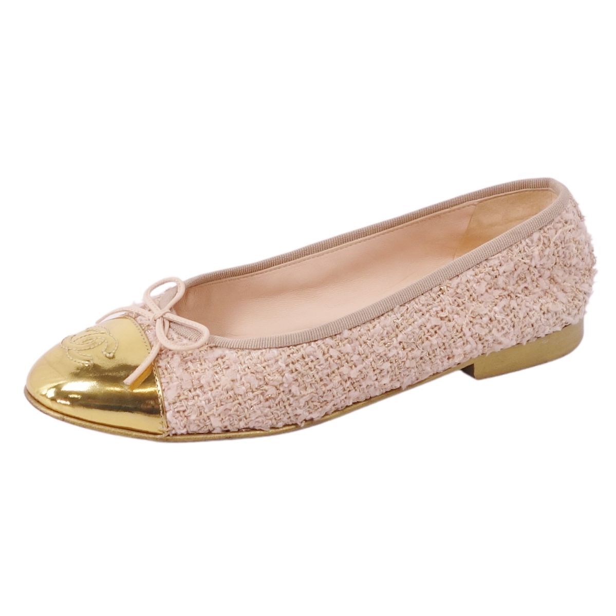 - 美品 シャネル CHANEL パンプス バレリーナ G02819 リボン ココマーク ツイード シューズ 靴 36.5C ベージュ/ゴールド ce07mn-rm07e32247