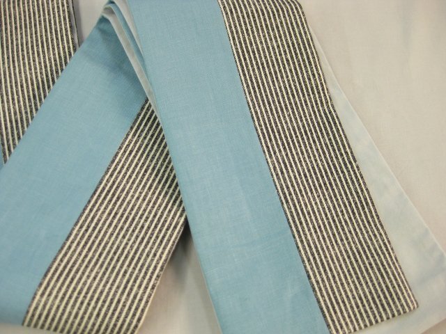 > 麻 半幅帯 仕立て上り 日本製 生成り 縞柄 麻細帯 ブルー