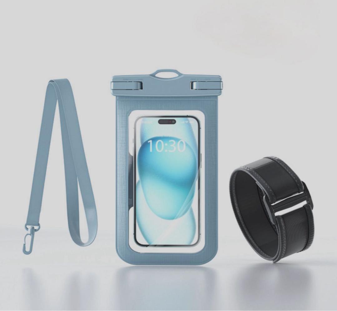 - 防水スマホケース アームバンド&ストラップ付き iPhone・Android対応 水色 水遊び