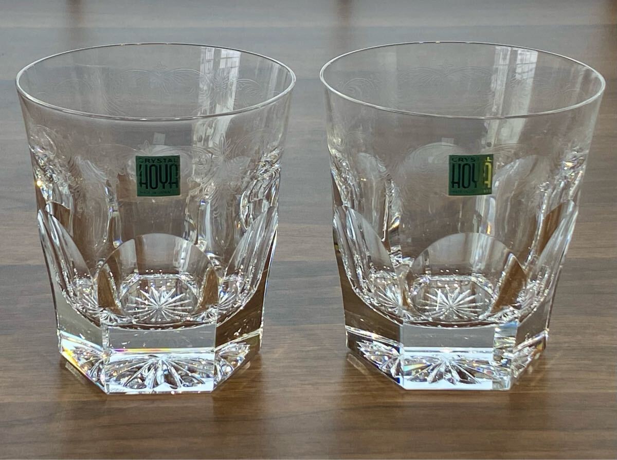 - HOYA ホヤ 最高級クリスタルガラス アラベスク模様 6面Qカット ロックグラス 2客 未使用!
