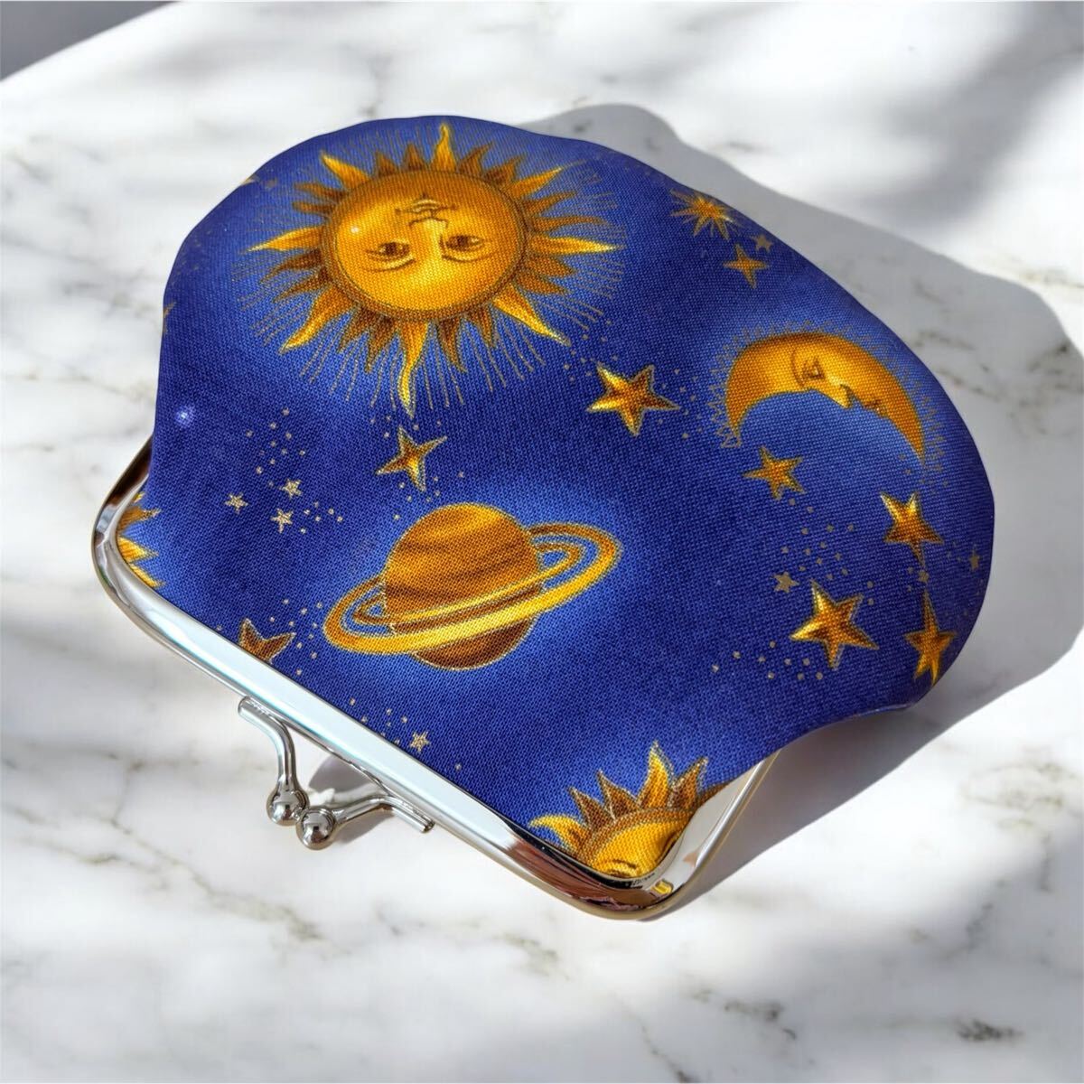 - 【送料無料】【1点のみ】太陽と月と土星と星柄★ちょっぴり大きめ 底が丸いがま口ポーチ