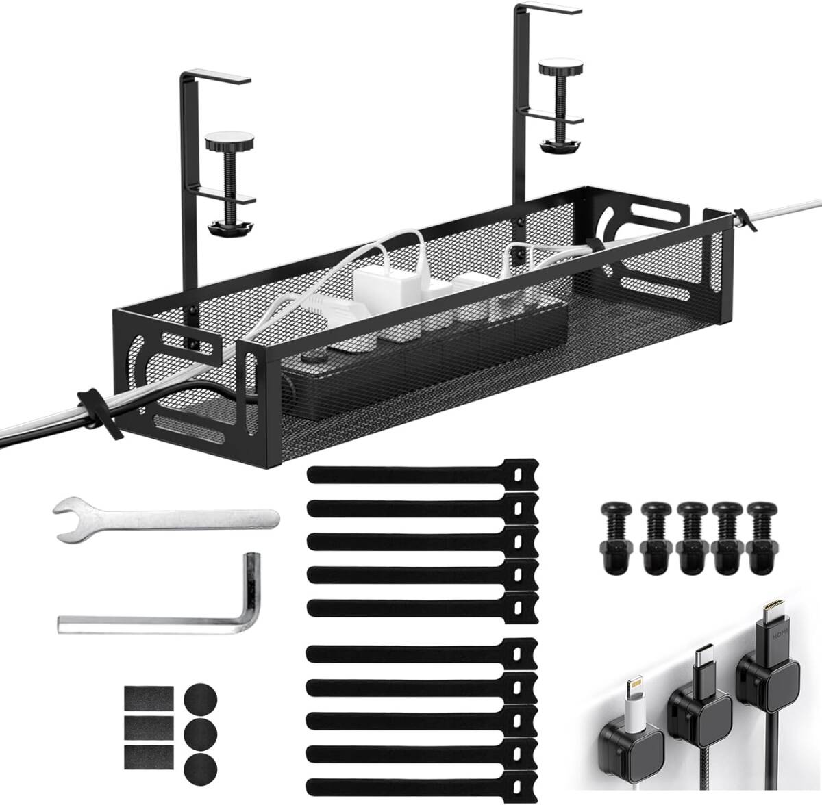 > ケーブルトレー デスク下 収納 幅40cm 穴あけ不要 クランプ式 配線隠し スチール製 ケーブルオーガナイザー コード整理 (ブラック)
