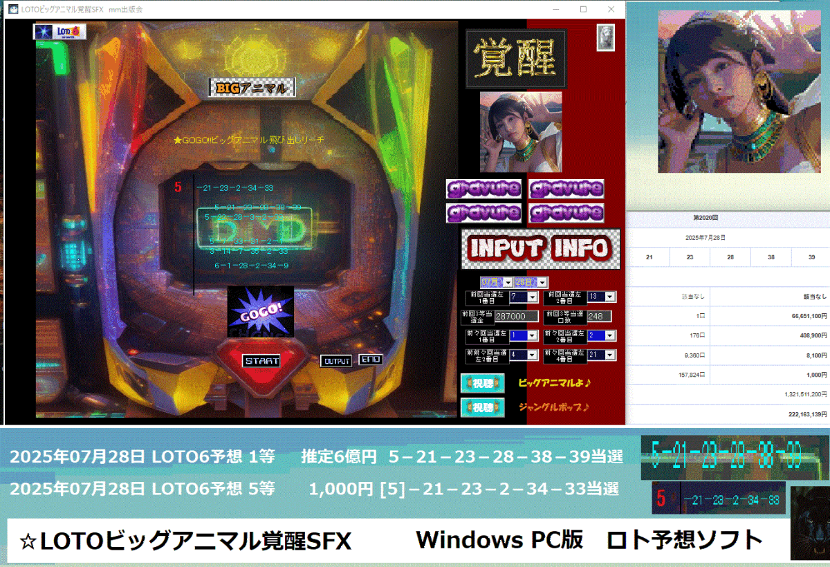 新作☆LOTOビッグアニマル覚醒SFX ☆ご案内させて頂きます 2025年07月28日 LOTO6予想 1等 推定6億円 5-21-23-28-38-39当選2025年07月28日 LOTO6予想 5等 1,000円 [5]-21-23-2-34-33当選2025年07月22日 ミニロト予想 1等 8,751,600円 2-5-21-24-28当選2025年07月22日 ミニロト予想 2等 96,200円 [2]-5-21-24-12当選2025年07月22日 ミニロト予想 3等 10,700円 2-5-21-24-1当選2025年07月22日 ミニロト予想 4等 900円 2-21-22-24-8当選SFXシリーズ予想ソフトは、唯一無二のmm出版会の技術を駆使した珍しい作品です!ここでいうSFXとは、動画で見せる演出のことです。 LOTOビッグアニマル覚醒SFXの予告演出は、すべてSFX動画になりますので、迫力満点です! 今回は、あのレイカちゃんとコラボの商品となります。レイカちゃんグラビア4つ閲覧できます。ご覧の通り、夏ロトに強いロトソフトです! (新作は最近も結果を出していて激熱となります!)最大の特徴は、ほかのロトソフトには類を見ないSFX動画予告演出が、あることです。(こんなの見たことないですよね。持っていて人に見せたらビックリします。大変価値があります)ウルトラ1億,1000万LOTOを夏は多数的中させて当選しています!2025年07月28日 LOTO6予想 1等 推定6億円 5-21-23-28-38-39当選2025年07月28日 LOTO6予想 5等 1,000円 [5]-21-23-2-34-33当選 ★GOGO!!ビッグアニマル飛び出しリーチ★GOGO!!ビッグアニマル歩き出しリーチ (レイカ◎おすすめ) [5]-21-23-2-34-33 (レイカ◎おすすめ) 5-21-23-28-38-392025年07月22日 ミニロト予想 1等 8,751,600円 2-5-21-24-28当選2025年07月22日 ミニロト予想 2等 96,200円 [2]-5-21-24-12当選2025年07月22日 ミニロト予想 3等 10,700円 2-5-21-24-1当選2025年07月22日 ミニロト予想 4等 900円 2-21-22-24-8当選 (レイカ◎おすすめ) [2]-5-21-24-12『LOTOビッグアニマル覚醒SFX』は、BIGな連荘状態です!1.ソフトを起動後、前回、前前回、前前々回の当選番号で確認できる数字を閲覧します。(ネット宝くじサイトやチャンスセンターお店の当選結果の貼り紙)2. 予想対象の抽選月日、券種予想モードボタン、前回の当選番号、3等当選金、3等当選口数、3.予想ボタンを押しますと、各ノーマルモードは、本線と押さえの予想が数点ずつメイン液晶パネルに表示されます。厚い予告で☆GOGOランプが出ます。(もちろん激熱!) 激熱予告で「宇宙人連れ去り」SFX動画演出が出ると激熱です! これで当選しますと、なんとも言えない感動もんです。(是非ご体験ください)予想モードは、LOTO6モード、MINI LOTO モードの2種類があります。4.買い目通りに、LOTOを購入されますと、先週の様に、うん千万円をたった200円で手にする事も、※使い方は、以上の通り、簡単です。初心者でも出来ます。【LOTOビッグアニマル覚醒SFX予想ソフトの説明】OSが、Windowsである事(推奨は、Windows11 ,10 ,8, 8.1 , 7 )。PC画面設定が、768*640 程度は有る事(大半のPCは大丈夫です) LOTOビッグアニマル覚醒SFXの予告演出は、すべてSFX動画になりますので、迫力満点です!高性能な独自の攻略方式解析機能を搭載している、★LOTOビッグアニマル覚醒SFX★で貴方も、今週から、ウハウハのLOTO生活を楽しんで見てはいかがでしょうか?☆LOTOビッグアニマル覚醒SFX☆ 価格397800円→5000円