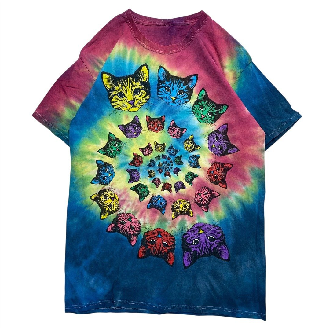 > Vintage タイダイ柄 スパイラル にゃんこ プリント Tシャツ 半袖 メンズ FREE 柄物 古着 サイケデリック ねこ ヴィンテージ ビンテージ