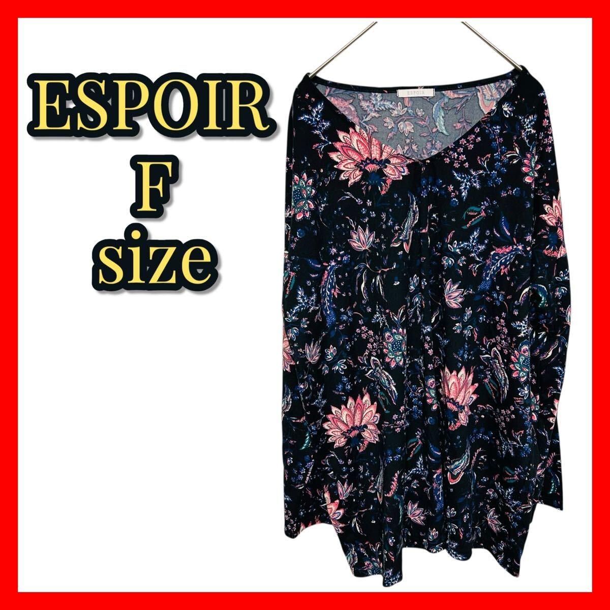 > 【ESPOIR】フリーサイズ シャツ ネイビー 花柄 長袖 薄手 Vネック ゆったりシルエット エスニック風 大人可愛い カジュアル 秋冬コーデ