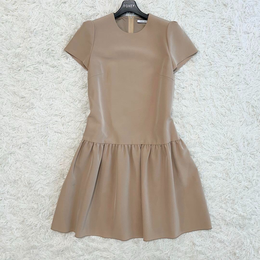 > 美品 FOXEY NEW YORK フォクシーニューヨーク ワンピース ベージュ 半袖 フレア エレガント 膝丈 フォーマル 38 M