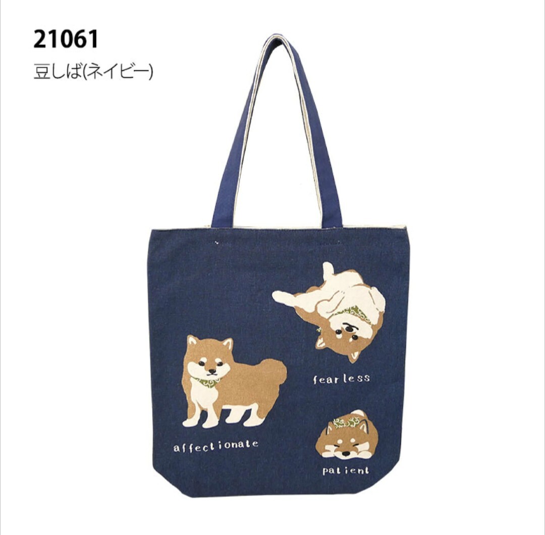 - トートバッグ タテ型トートバッグ 豆しば ネイビー 犬 イヌ アニマル 動物 背面ポケット キャンバストート A4サイズ
