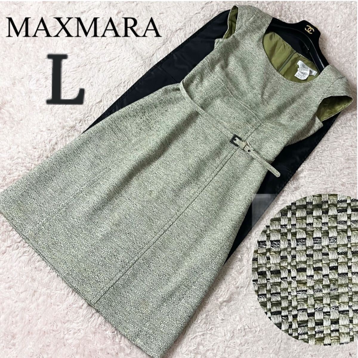 - MAXMARA マックスマーラ 白タグ ツイード ワンピース Aライン フレア 半袖 大きいサイズ ベルト グリーン グレー L