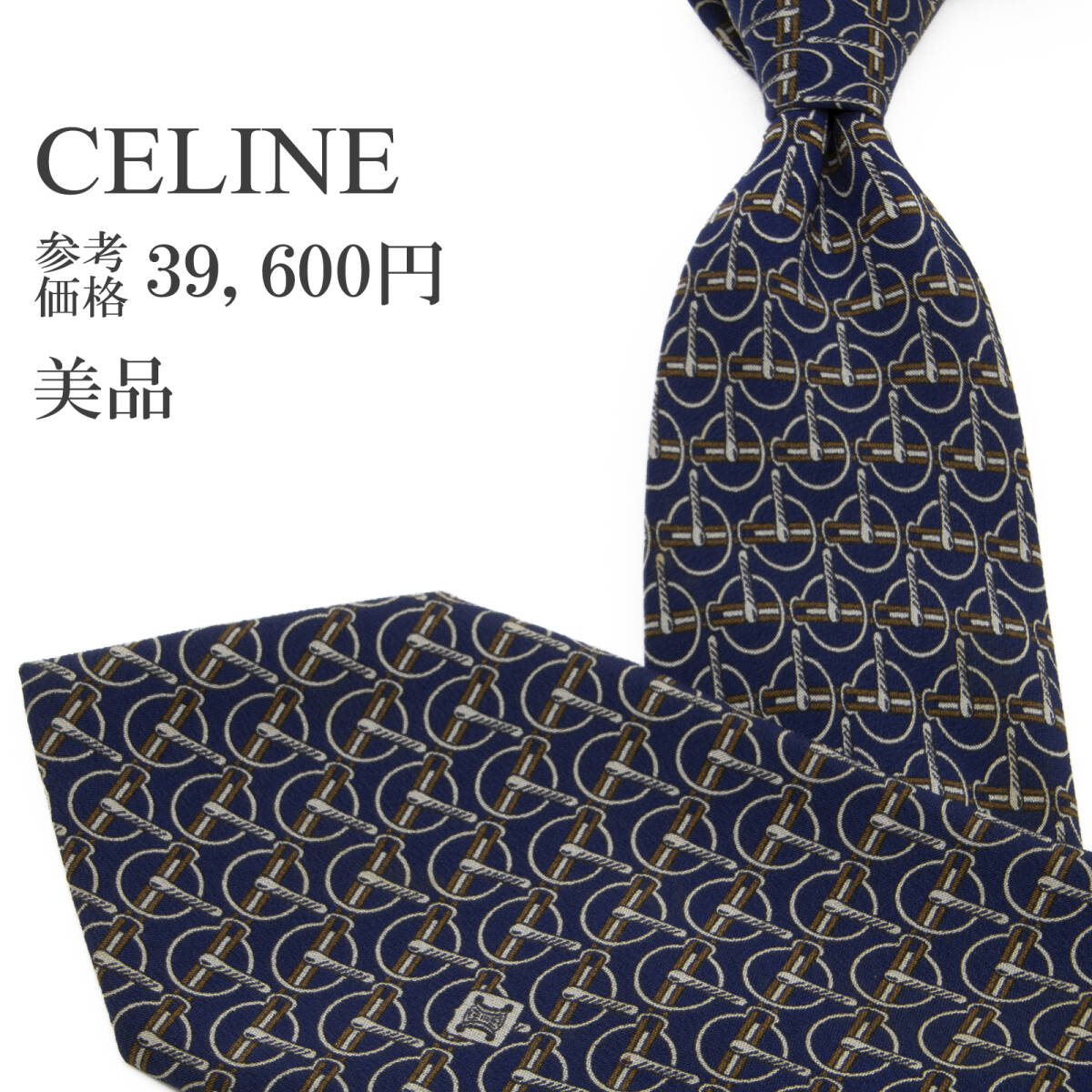 - 送料無料 セリーヌ ネクタイ レギュラータイ シルク ネイビーブルー グレー 茶色 ブラウン ロゴ マーク ブランド 珍しい スペイン製 P420