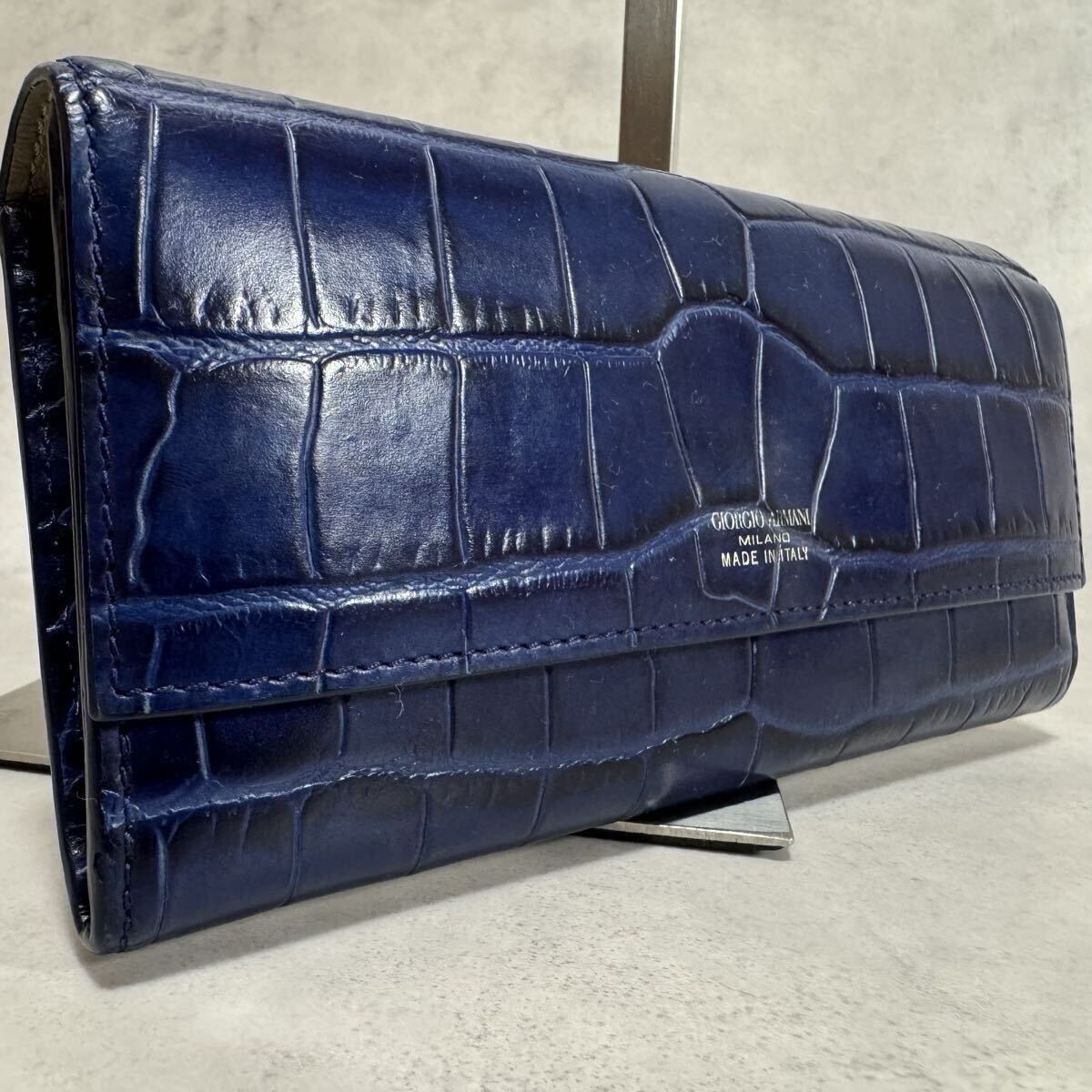 - 美品 ジョルジオアルマーニ GiorgioArmani 長財布 クロコ 型押し ワニ レザー ネイビー メンズ レディース プリントロゴ