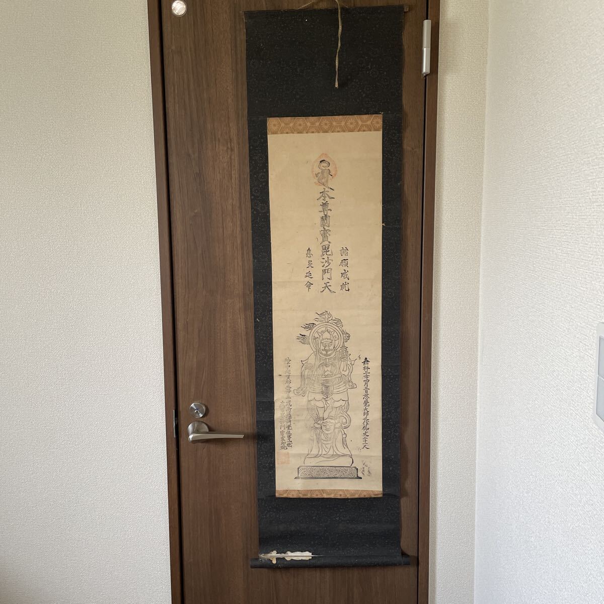 > 【版画】掛け軸 仏教 毘沙門天 四天王 財宝 武戦勝祈願 国家鎮護 信仰 立像 甲冑 宝塔 槍 神道 神社 護符 紙本版摺 木版 希少