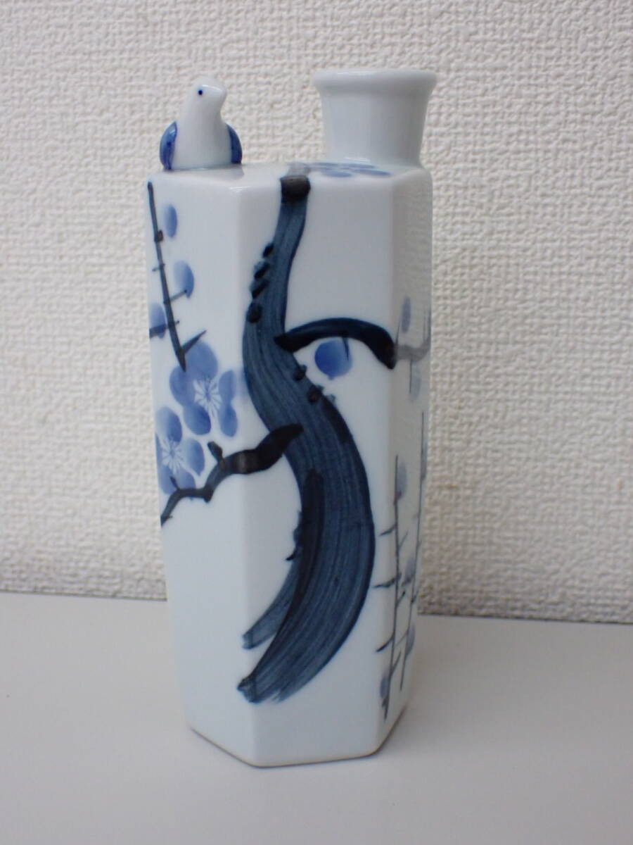 > 陶磁器-119; 美濃 作山窯 花瓶 花入 花器 染付 六角 梅文 鳥 高さ;約15.3×6.5×5.8×口径1.4cm ★