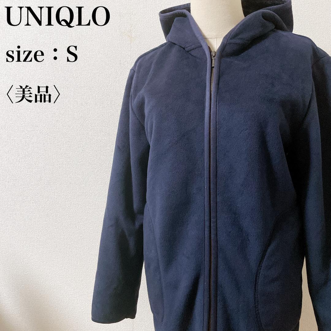 - 【美品】UNIQLO ユニクロ フリース ロングパーカー ネイビー 裏起毛 ロングコート ジップアップ フード付き リラックス カジュアル キ55