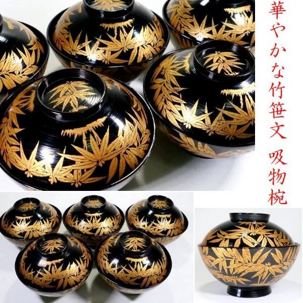 【 恵 #1778 】 華やかな竹笹文美しき吸物椀 金蒔絵 五客 木製 黒漆塗 検:懐石 茶道 茶道具