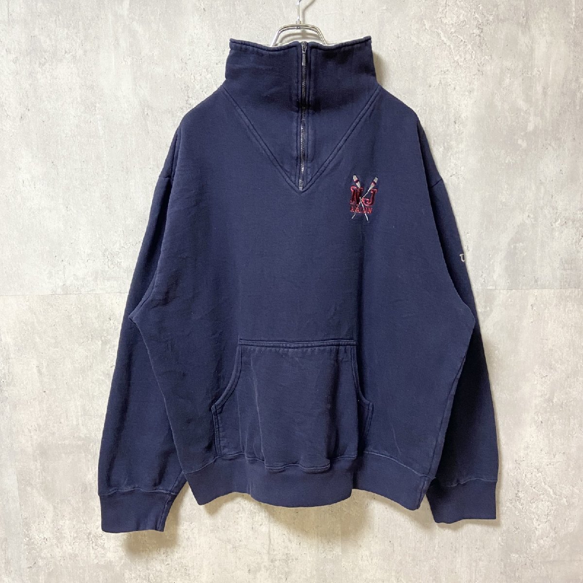 - 古着 used BEACON POINT 長袖ハーフジップスウェット トレーナー ワンポイントロゴ刺繍 ネイビー XXLサイズ