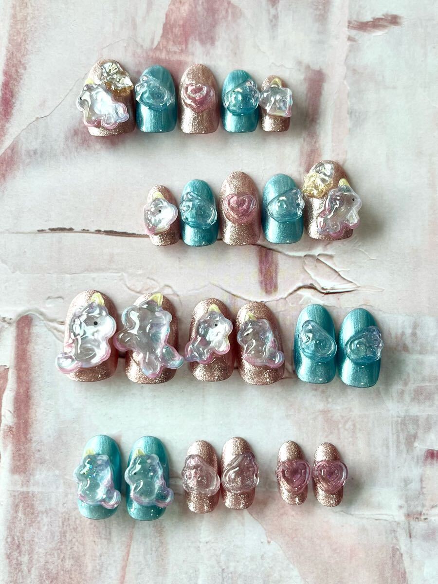 - ハンドメイド ネイルチップ レギュラーオーバル ユニコーン ゆめかわ ピンク ブルー ラメ
