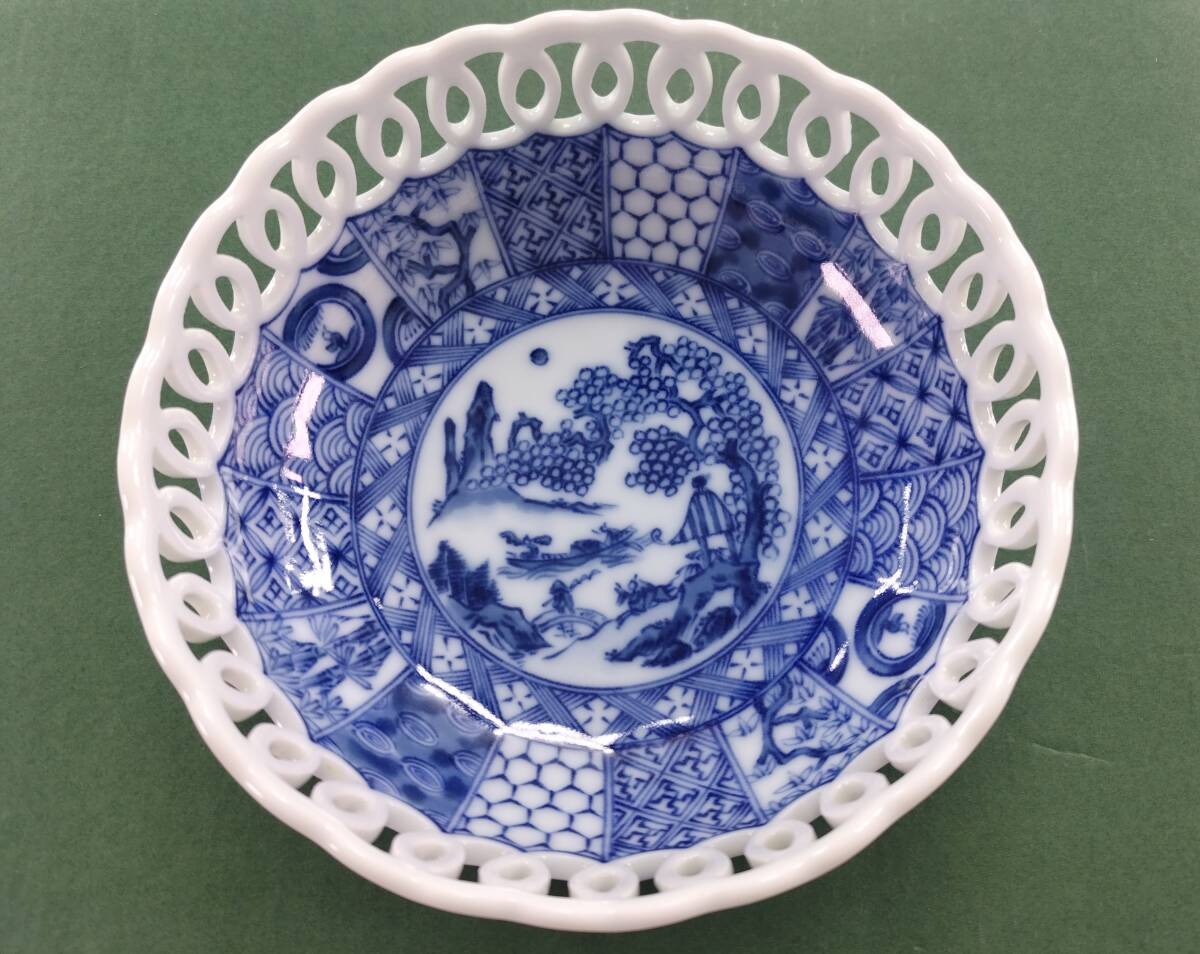 - 專龜【美品】中からも外から見ても美しい 龍峰窯 花風流祥瑞丸紋透かし 鉢 皿 銘々皿 器 日本 和風 伝統 メイン 漬物 焼物 和食 鉢 青