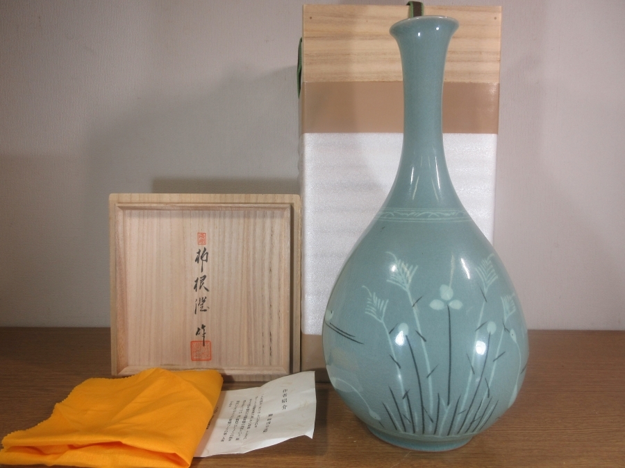 - 【真作保証】 柳海剛 (柳根瀅) 自作 高麗青磁白黒象嵌草花柳池鳥文花瓶 人間文化財 (柳宗悦 池順鐸 安東五 方澈柱) 韓国