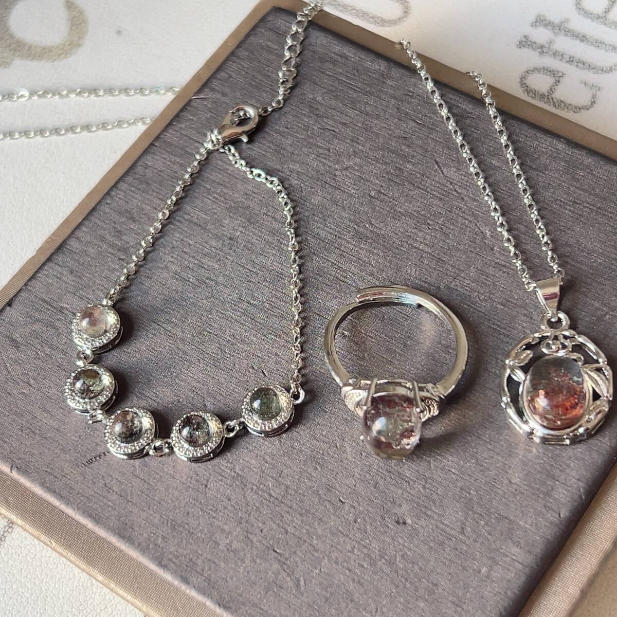 > 3点セット◇高透明度◇ガーデンクォーツ(庭園水晶)◇ネックレスペンダント+リング+ブレスレット◇パワーストーン◇天然石◇039S882