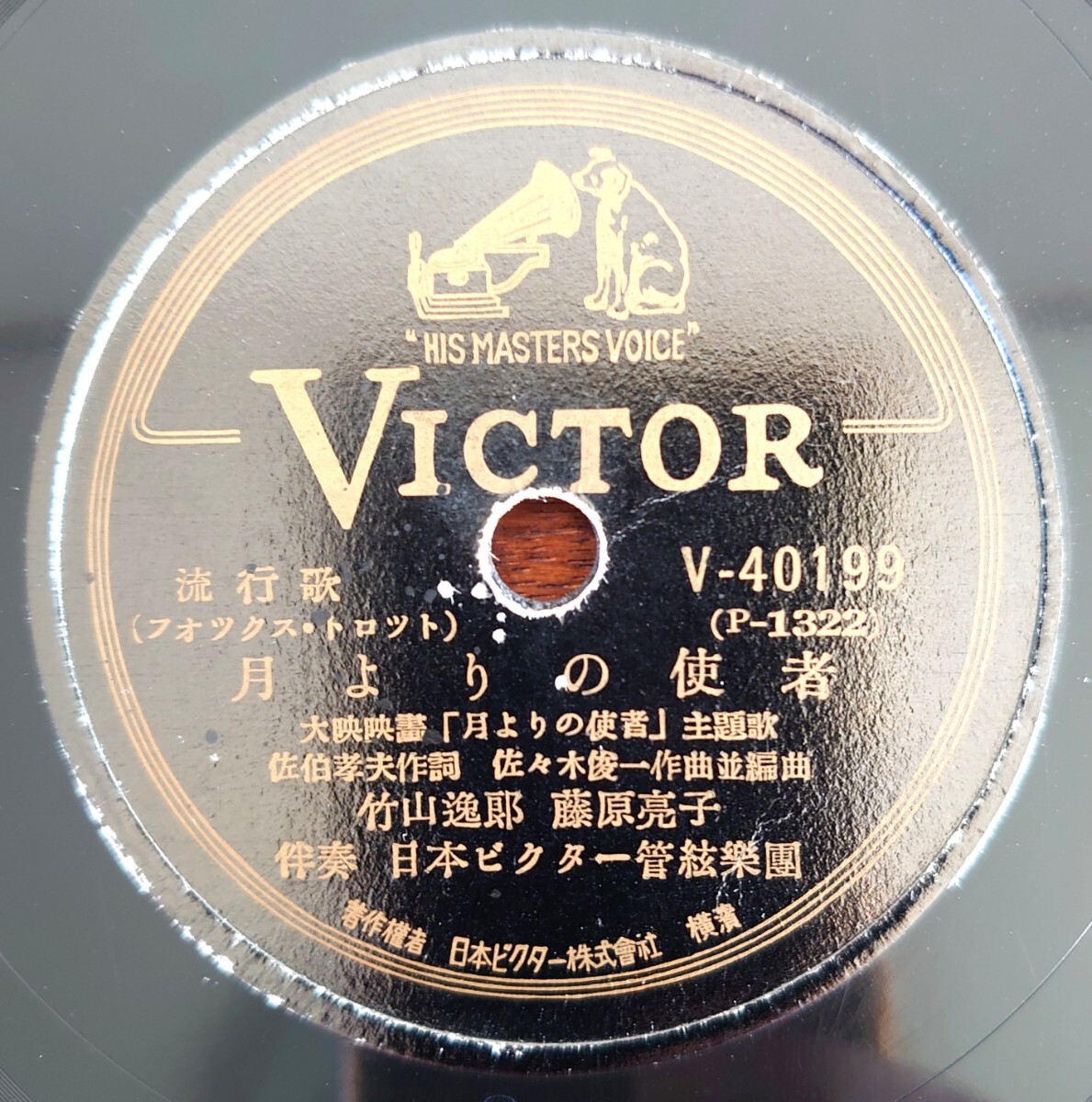 - 【SP盤レコード】VICTOR V-40199 流行歌/大映映画「月よりの使者」主題歌/同題 竹山逸郎 藤原亮子/夜霧の砂丘 平野愛子
