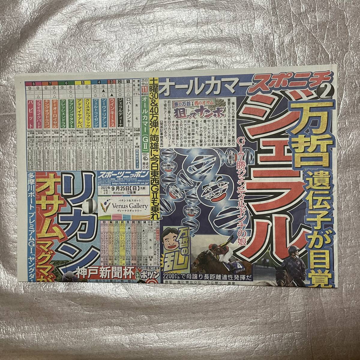 > 【新品未読】スポーツニッポン 2022年9月25日発刊 表紙:オールカマーGⅡ競馬予想 須田亜香里卒業コンサート中刷り記事