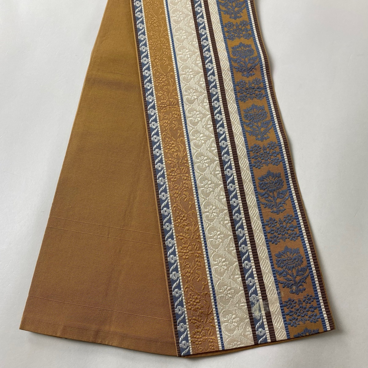 - 半幅帯 秀品 証紙 博多織 草花 縞 山吹茶色 正絹 【中古】